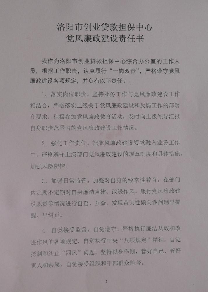 按照《洛阳市人力资源和社会保障局关于层层签订党风廉政建设责任书的通知》{2017}5号文件要求, 4月17日,创贷中心召开会议,认真传达了文件精神,并与全中心员工逐人签订了《党风廉政建设责任书》,传导工作压力,层层压实基层主体责任。